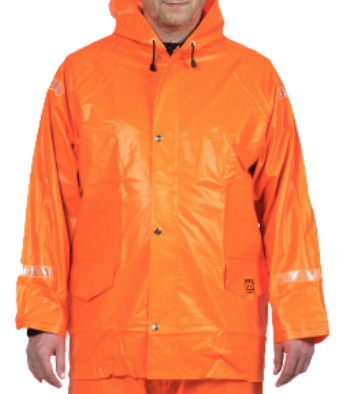 Reinforced sleeves and seams. Two front pockets. Adjustable hood Material is oil and cold resistant. Zipper with snap tab. Visibility on sleeves.