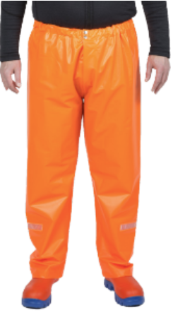 Snaps at the waist with elastic for a snug fit. Snaps at the legs. The material is oil and cold-resistant.