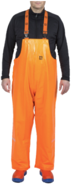 Reinforced cuffs. Reversible. Bib and wide, elastic shoulder straps fastener. Material is oil and cold resistant. Visibility on legs.